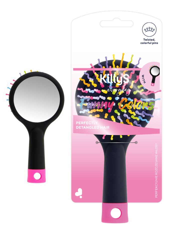 تعريف: فرشاة شعر ملونة تحتوي على مراية مدمجة. المكونات: مواد متينة، تصميم ملون، مرآة. الاستخدام: تستخدم لتمشيط الشعر وتصفيفه مع إمكانية مشاهدة النتائج. المزايا: تصميم مريح وعملي، ملونة وجذابة. النتائج: شعر ممشط ومنسق بشكل جميل.