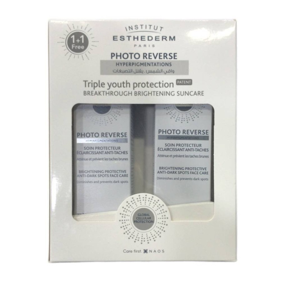 كريم واقي ومفتح للتصبغات من اسثديرم – 50 مل كريم للوجه يكافح شيخوخة البشرة، ويمنع ظهور البقع البنية. ويزيل آثار البقع الظاهرة ويوفر حماية عالية من أشعة الشمس أ، ب. يقوم هذا المنتج بعدد من الوظائف التي تساعد على استعادة البشرة لشبابها ونضارتها طريقة الاستخدام : يوضع كريم العناية الوقائية ضد الشيخوخة ومضاد للإجهاد - حماية عالية جداً -PHOTO REVERSE Brightening Protection Anti-Dark Spots Face Care" على الوجه والرقبة ومنطقة أعلى الصدر قبل 20 دقيقة من التعرض للشمس. يعاد وضعه كل ساعتين وبعد السباحة. مثالي ككريم نهاري، مقاوم للبقع الداكنة في الصيف.