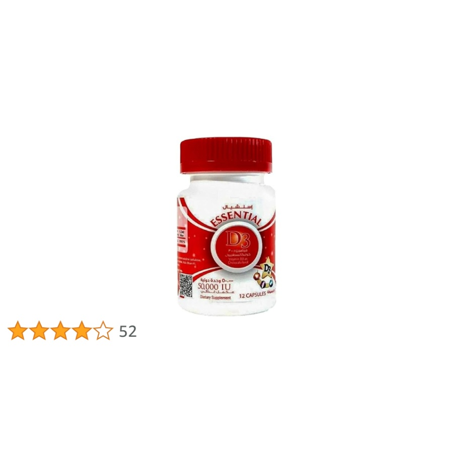 إيسينشيال دي٣ ٥٠٠٠٠ وحدة دولية ١٢ كبسولة WS هي كبسولات تحتوي على جرعة عالية من فيتامين د٣ (كولي كالسيفيرول) بتركيز ٥٠٠٠٠ وحدة دولية. يستخدم هذا التركيز العالي عادة لعلاج نقص فيتامين د الشديد أو للمرضى الذين يعانون من مشاكل في الامتصاص. تحتوي هذه العبوة على ١٢ كبسولة، غالباً ما توصف لتناولها أسبوعياً أو كل أسبوعين.