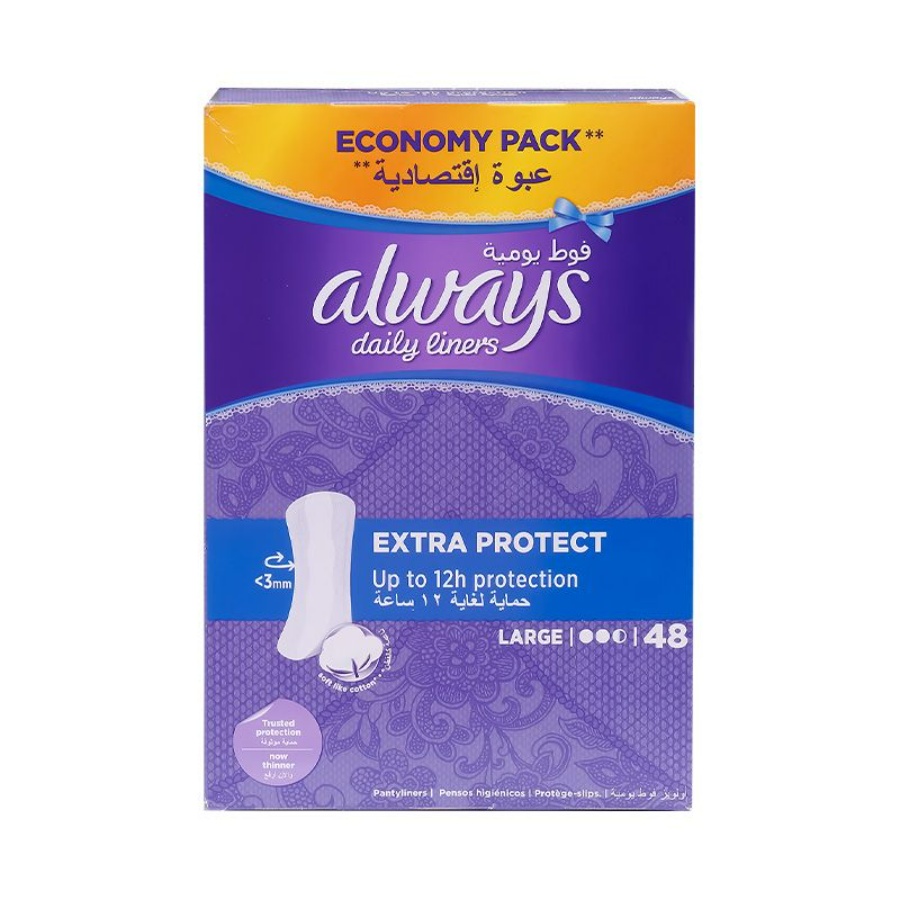 فوط Always Everyday Pantyliner الكبيرة مصممة لتوفير حماية يومية موثوقة وراحة فائقة. حجمها الكبير يوفر تغطية إضافية لزيادة الأمان. عبوة ضخمة توفر قيمة ممتازة وتكفي لفترة طويلة.