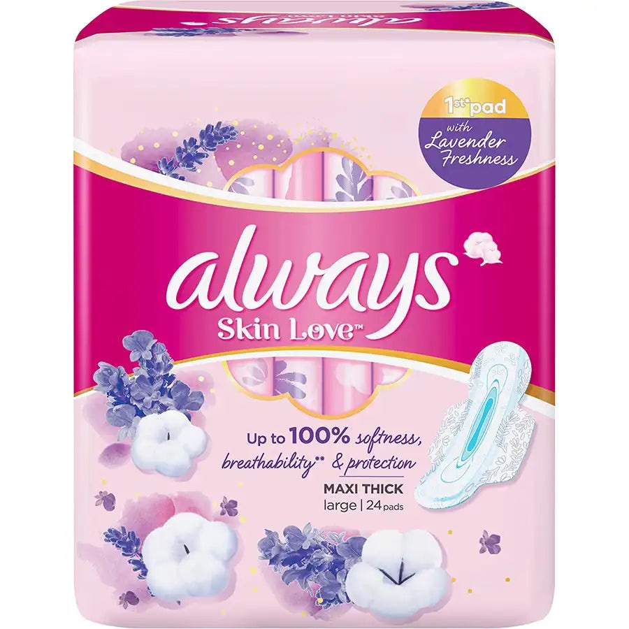 فوط Always Skin Love Maxi Thick Large توفر حماية قوية مع عناية لطيفة بالبشرة. سميكة وكبيرة، تمنحك الثقة والأمان بينما تحافظ على بشرتك مرتاحة وغير متهيجة. عبوة مناسبة للاستخدام المنتظم.