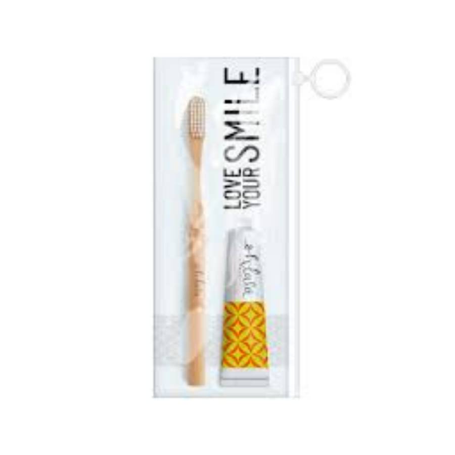 يحتوي على معجون أسنان بحجم 15 مل وفرشاة أسنان صغيرة من الخيزران.