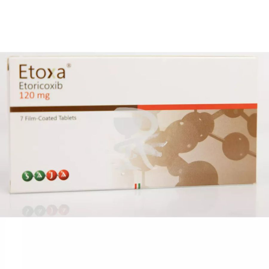 إيتوكسا ١٢٠ ملجم ٧ أقراص تحتوي على إيتوريكوكسيب ١٢٠ ملجم، وتستخدم لتسكين الألم الحاد بما في ذلك آلام جراحة الأسنان والتهاب المفاصل النقرس الحاد. هذه الجرعة الأعلى مخصصة للاستخدام قصير الأمد للتحكم في الأعراض الحادة الشديدة. تحتوي هذه العبوة على ٧ أقراص.