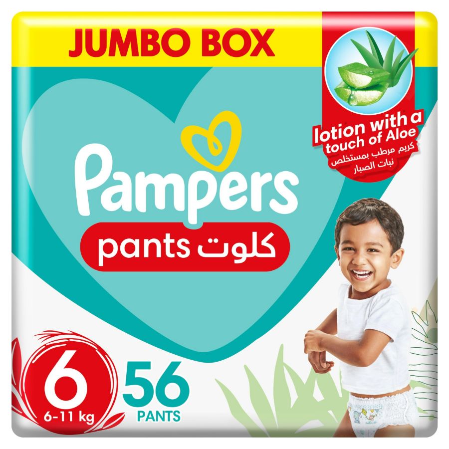 الوصف: بامبرز كلوت مقاس 6، مناسبة للأطفال بوزن 14+ كجم. العبوة تحتوي على 56 كلوت. المزايا: مثالية للأطفال النشطين. توفر حماية من التسربات مع سهولة الاستخدام. طريقة الاستخدام: اسحبي الكلوت لأعلى كالسروال العادي.