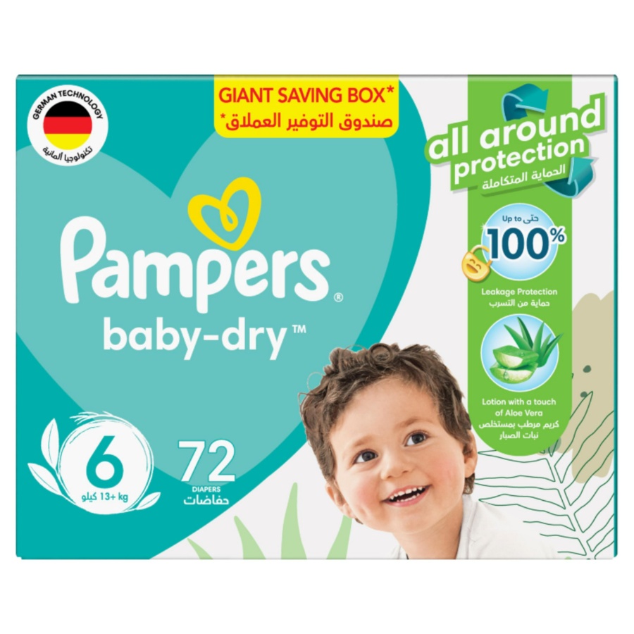الوصف: حفاضات بامبرز ميجا رقم 6، مناسبة للأطفال من 15 كجم فما فوق. العبوة تحتوي على 72 حفاضة. المزايا: مثالية للأطفال الأكبر سنًا. توفر حماية طويلة الأمد من التسربات. تصميم مرن يوفر راحة فائقة. طريقة الاستخدام: تأكدي من أن الحفاضة مثبتة بشكل محكم حول خصر الطفل.
