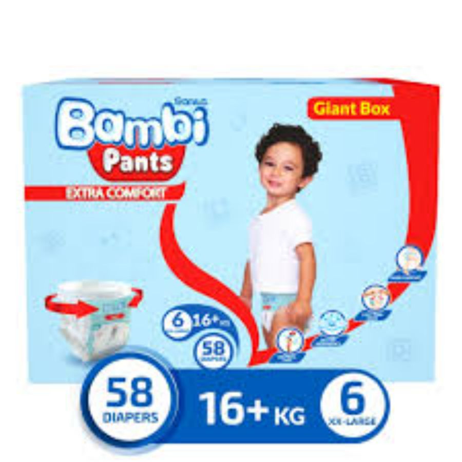 حفاضات بامبي مقاس 6 (XXL) توفر حماية سهلة الاستخدام بأسلوب السروال للأطفال الصغار النشطين. توفر امتصاصًا ممتازًا وملاءمة مرنة تتحرك مع طفلك، مما يوفر الراحة والحماية من التسرب. يحتوي هذا الصندوق الجامبو على 58 سروال حفاض، وهو مثالي للأطفال الأكبر حجمًا.