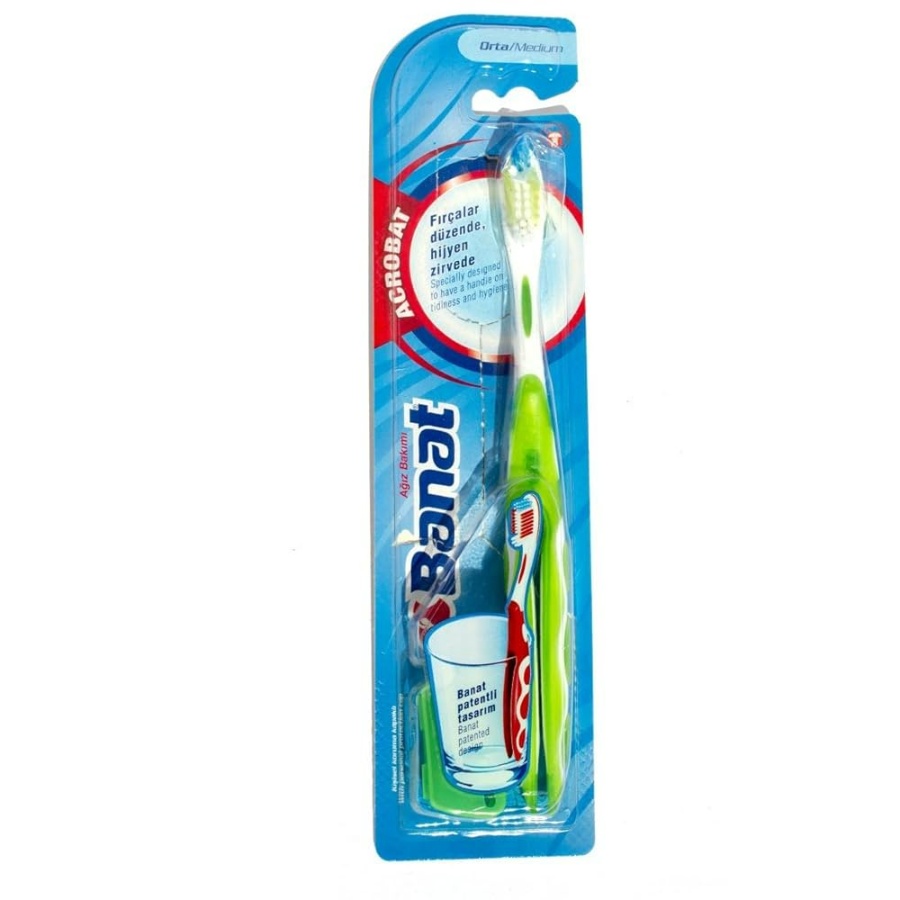 فرشاة أسنان BANAT ACROBAT PLUS بشعيرات متوسطة، تتميز برأس مرن يصل إلى المناطق التي يصعب الوصول إليها. توفر تنظيفًا عميقًا وفعالًا مع شعور بالراحة.