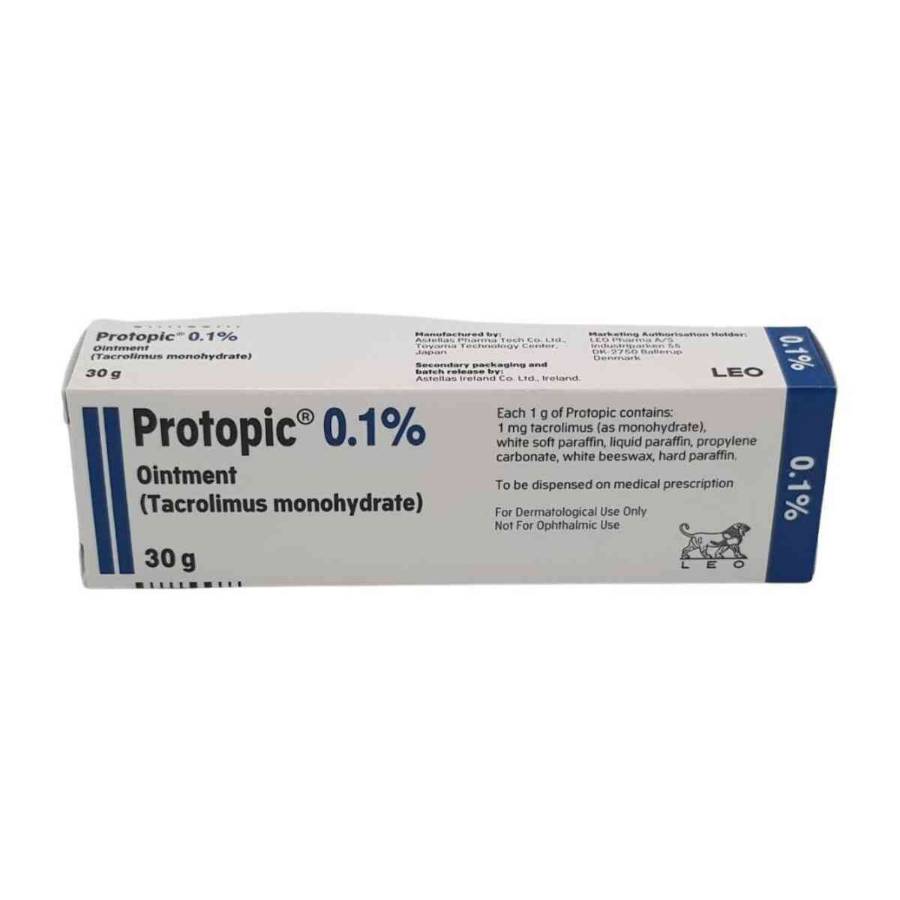 مرهم بروتوبِك بتركيز 0.1%. يستخدم لعلاج بعض الأمراض الجلدية مثل الإكزيما. يأتي في أنبوب بوزن 30 جرام.