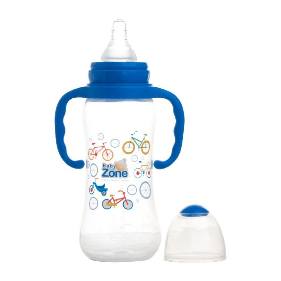 رضّاعة انسيابية من بيبي زون، سعة 250-275 مل، موديل BLF 8532. تتميز بشكل انسيابي وربما تحتوي على خشخيشة (قرقيشة). تصميم مريح لسهولة التعامل.