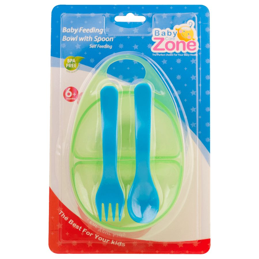 طقم أدوات مائدة من بيبي زون، موديل BLF 8442. يحتوي على ملعقتين (صغيرة وكبيرة) وشوكة. مصمم لإطعام الرضع والأطفال الصغار في مراحل مختلفة.