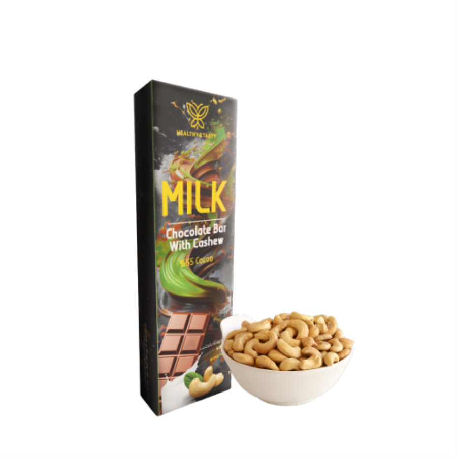 الوصف: شوكولاتة بالحليب مع الكاجو، تحتوي على 55% كاكاو. المزايا: غنية بالدهون الصحية من الكاجو. تحتوي على مضادات الأكسدة. طريقة الاستخدام: وجبة خفيفة أو حلوى. المحتوى الغذائي: السعرات الحرارية: ~220-240 سعرة حرارية. الدهون: ~14-16 جرام. البروتين: ~5-6 جرام. الكربوهيدرات: ~18-20 جرام.