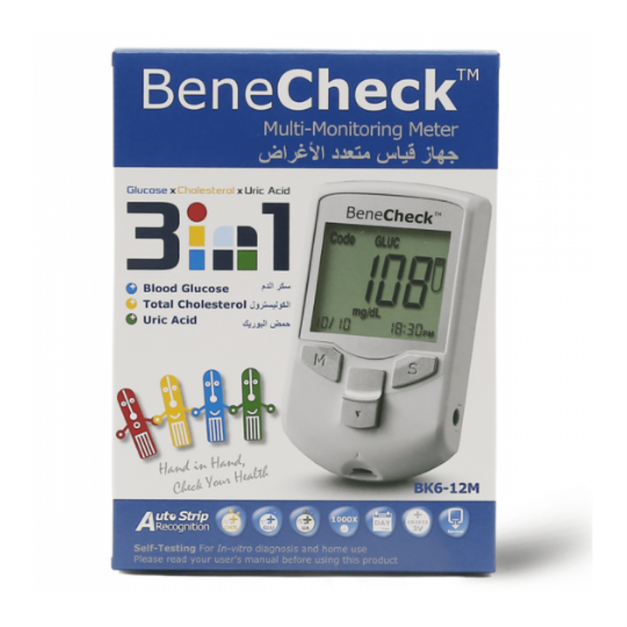 جهاز متعدد الوظائف، يستخدم لقياس السكر والكوليسترول وحمض اليوريك. المكونات: مواد بلاستيكية آمنة وشاشة رقمية. طريقة الاستخدام: يتم استخدامه وفقًا لإرشادات الطبيب. المزايا: يوفر قياسًا دقيقًا وسريعًا.
