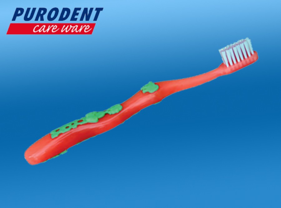 فرشاة أسنان بيورودنت جونيور مخصصة للأطفال، بشعيرات ناعمة لتنظيف لطيف وتصميم مريح لسهولة الاستخدام.