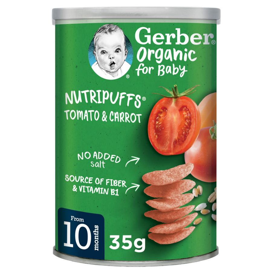 وجبات جيربر الخفيفة المالحة بالطماطم والجزر متوفرة في عبوة تحتوي على 5 حصص فردية، وزن كل منها 35 جراماً. هذه الوجبات الخفيفة المصنوعة من الخضروات مناسبة للأطفال الصغار، لتقديم نكهات مالحة لهم بتنسيق ناعم وسهل الأكل. طريقة جيدة لتشجيع تناول الخضروات.