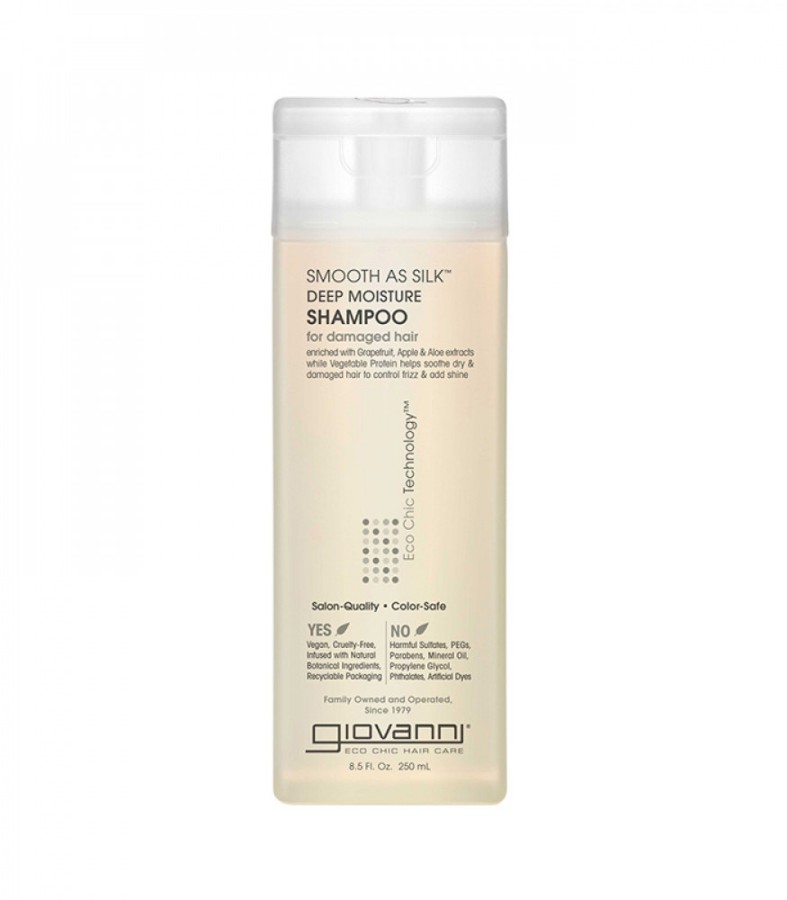 شامبو سموث اس سيلك للترطيب العميق للشعر من جيوفاني 250مل : شامبو ناعم وممتع وجذاب ورائع. فهو يشبه ما تشعرين به عند ملامسة الحرير لبشرتك غني بمستخلصات الجريب فروت والتفاح والصبار بينما يساعد البروتين النباتي على تنعيم الشعر الجاف والتالف والسيطرة على الشعر الهايش وإضفاء اللمعان عليه يكون رغوة غنية للمساعدة في تنعيم الشعر الجاف والتالف والمعالج كيميائيًا ينظف الشعر بلطف وينعمه لكي تتمكني من تصفيفه مثالي للشعر المجهد أو التالف من العوامل البيئية المحيطة خالٍ من كبريتات اللوريل واللوريث