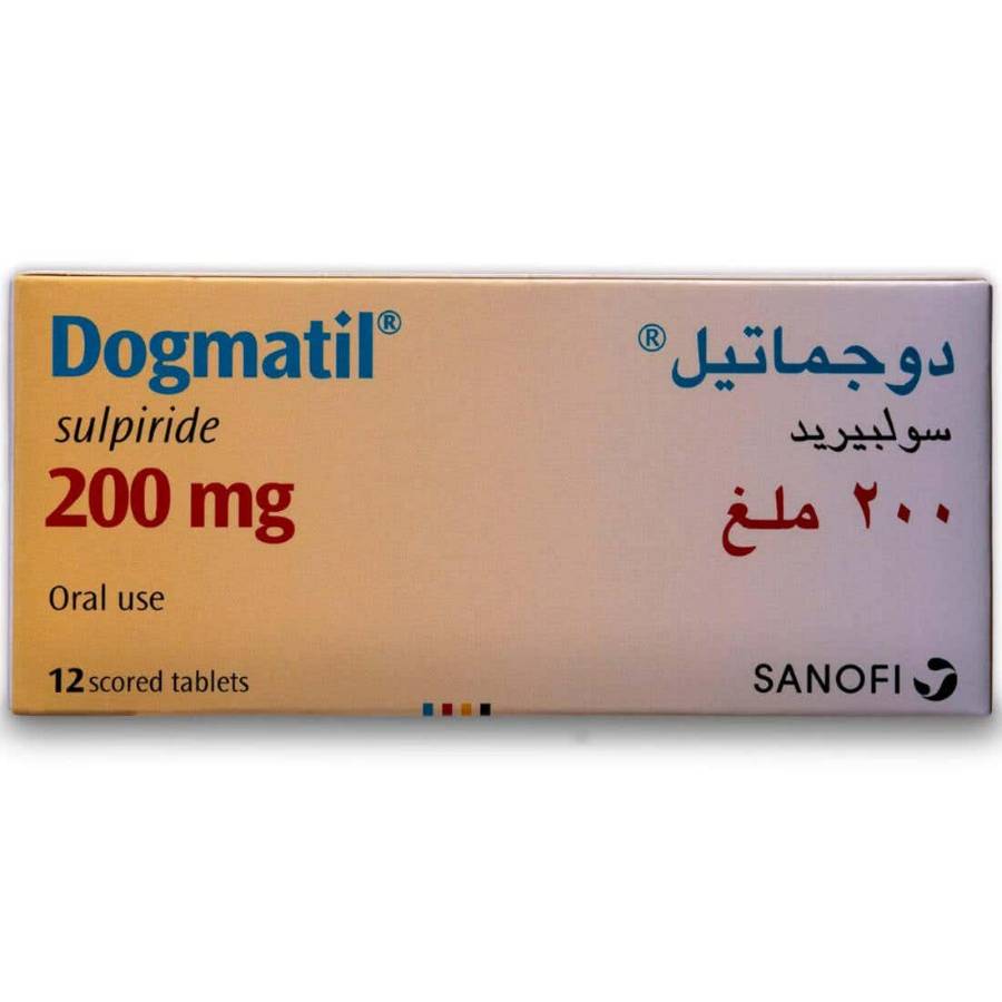 أقراص دوجماتيل ٢٠٠ ملجم تحتوي على سولبيريد، وهو مضاد ذهان من عائلة البنزاميد يستخدم لعلاج أنواع معينة من الحالات النفسية، بما في ذلك القلق وبعض أشكال الاكتئاب، بالإضافة إلى الدوار. يستخدم هذا التركيز الأعلى عادة للحالات أو الأعراض الأكثر شدة. تحتوي العلبة على ١٢ قرصاً.