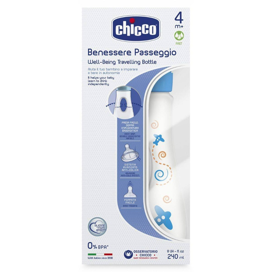 زجاجة رضاعة Well-Being مائلة من شيكو مصممة للأطفال بعمر 0 أشهر فما فوق. الشكل المائل يساعد على إبقاء الحلمة ممتلئة بالحليب، مما يقلل من ابتلاع الهواء والغازات. سعتها 250 مل وتوفر وضعية رضاعة مريحة.