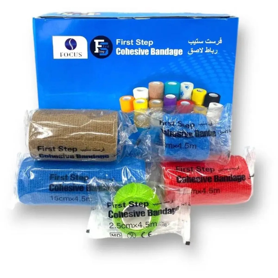 رباط ضاغط من فرست ستيب بعرض 5 سم وطول 4.5 متر، مصمم لتثبيت الضمادات أو توفير دعم إضافي للمفاصل والعضلات أثناء الإصابات أو الرياضة.