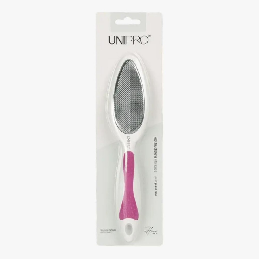 حجر ملمس مزدوج الجوانب، على الأرجح مبرد قدم أو أداة مماثلة لإزالة الجلد الميت. جزء من مجموعة UNIPRO، يتم التعرف عليه برمز 5103. يقدم كل جانب خشونة أو ملمسًا مختلفًا لتنعيم وتقشير فعال للبشرة الخشنة. أداة عناية شخصية متينة.