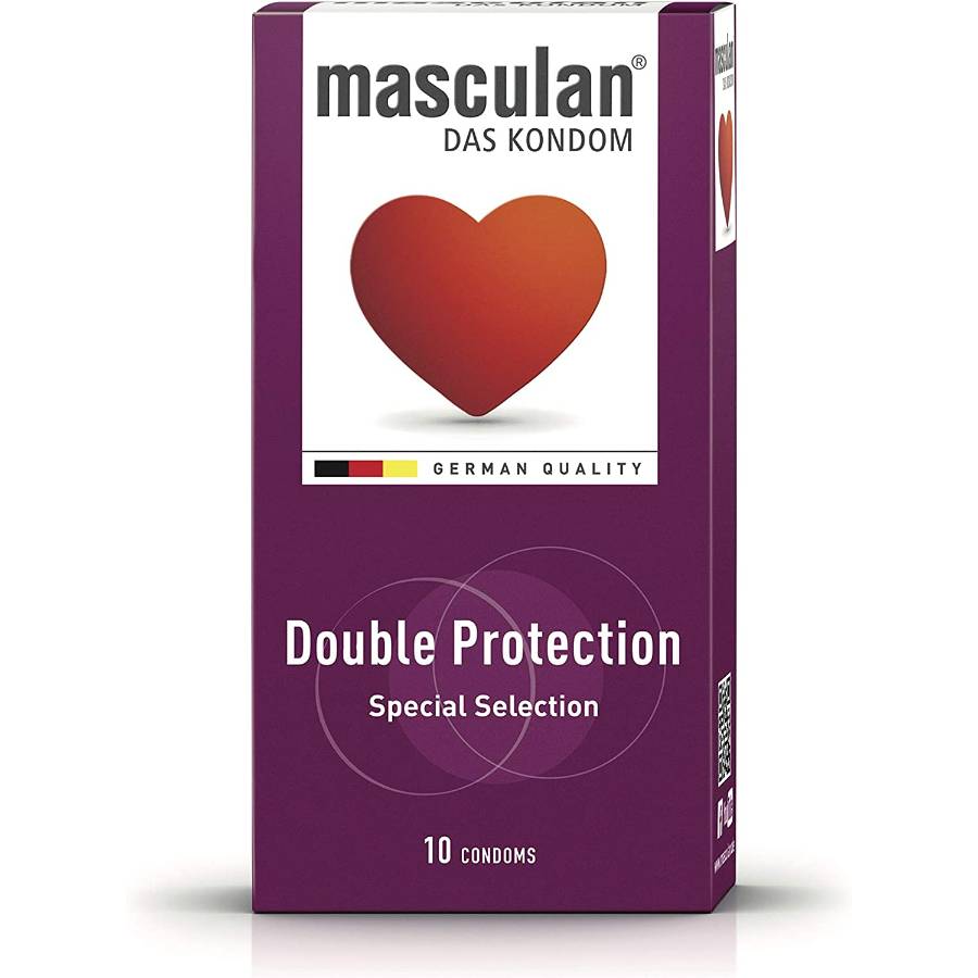 واقي ذكري ماسكولان حماية مزدوجة، يأتي في عبوة تحتوي على 10 قطع. قد يشير إلى سمك أكبر أو تصميم خاص يوفر حماية إضافية. يُستخدم لزيادة الأمان والثقة أثناء العلاقة.