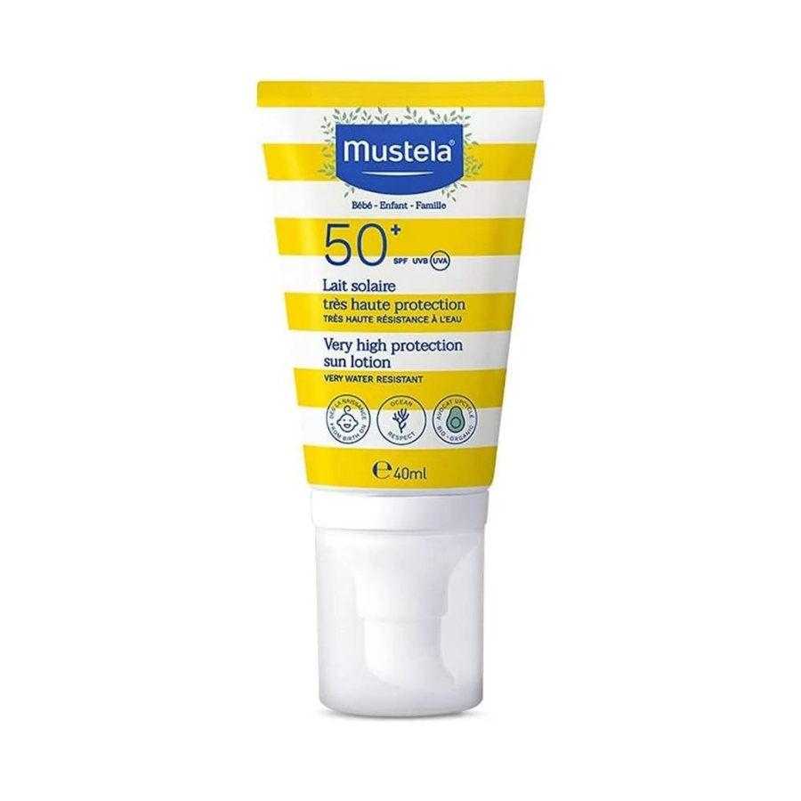 واقي الشمس موستيلا للأطفال SPF 50+ (40 مل) - واقي شمس عالي الحماية (SPF 50+) مقاوم للماء ومناسب للبشرة الحساسة. طريقة الاستخدام: كرر التطبيق كل ساعتين أثناء التعرض للشمس.