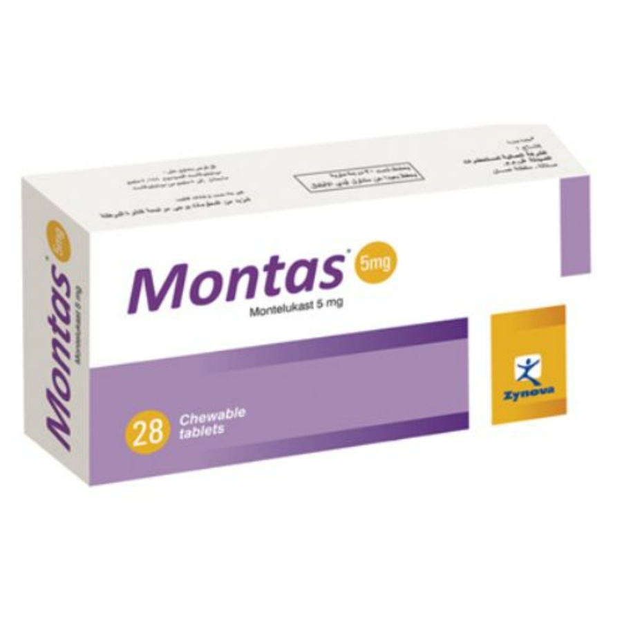 أقراص مونتاس للمضغ بتركيز 5 ملغ، 28 قرصًا (عبوة موفرة). مناسبة للأطفال الأكبر سنًا والمراهقين لعلاج الربو والحساسية. توفر نفس الفعالية في شكل قرص مضغ سهل الاستخدام.