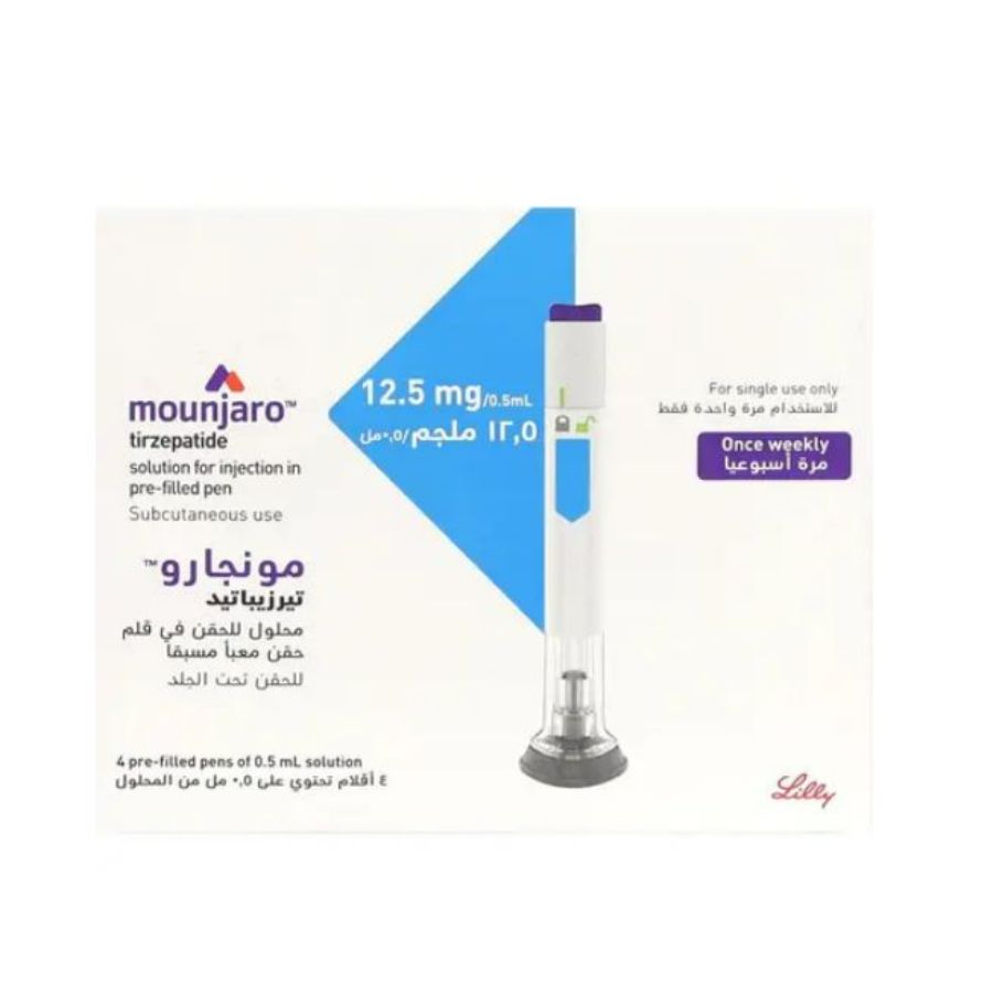 قلم مونجارو بتركيز 12.5 ملغ، 4 أقلام جاهزة للحقن. جرعة أعلى من مونجارو لعلاج السكري من النوع الثاني والوزن الزائد. يوفر تحكمًا فعالًا في سكر الدم ويساهم في خسارة الوزن الملحوظة.