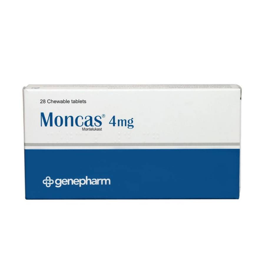 أقراص مونكاس بتركيز 4 ملغ، 28 قرصًا. جرعة أقل من مونكاس تستخدم لعلاج الربو وأعراض الحساسية، غالبًا للأطفال. تعمل الأقراص على تحسين وظائف التنفس وتقليل الالتهاب في الشعب الهوائية.