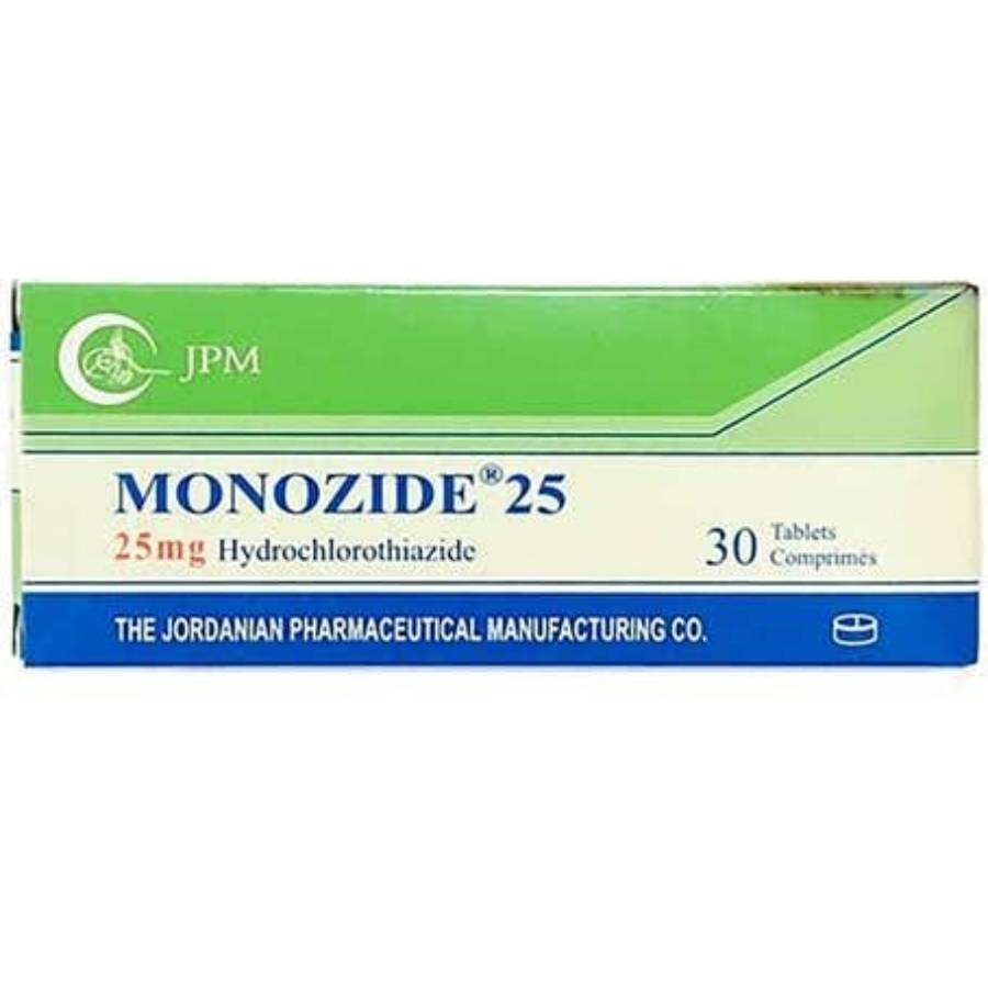 أقراص مونوزايد بتركيز 25 ملغ، 30 قرصًا. جرعة أعلى من مونوزايد لعلاج ارتفاع ضغط الدم أو حالات احتباس السوائل الشديدة. يجب استخدامه بدقة تحت إشراف طبي لمراقبة مستويات الإلكتروليتات في الجسم.