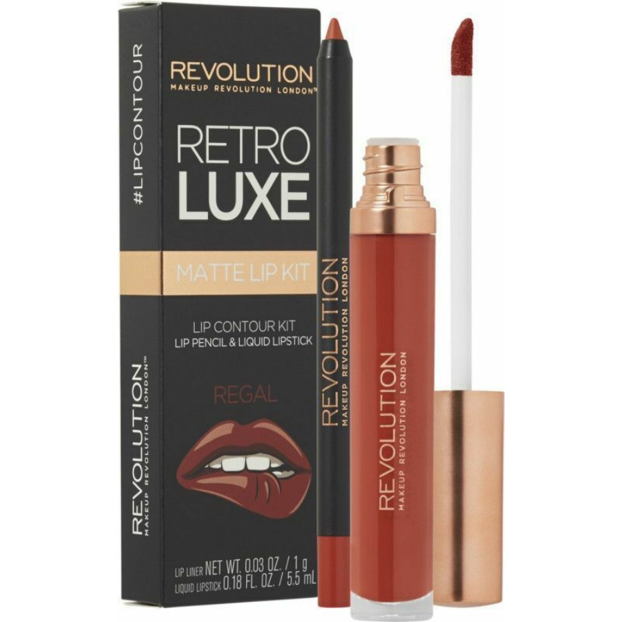تحتوي مجموعة أحمر الشفاه غير اللامعة ريترو لوكس من ميك أب ريفوليوشن على أحمر شفاه سائل بلمسة نهائية غير لامعة، وقلم تحديد شفاه مطابق.