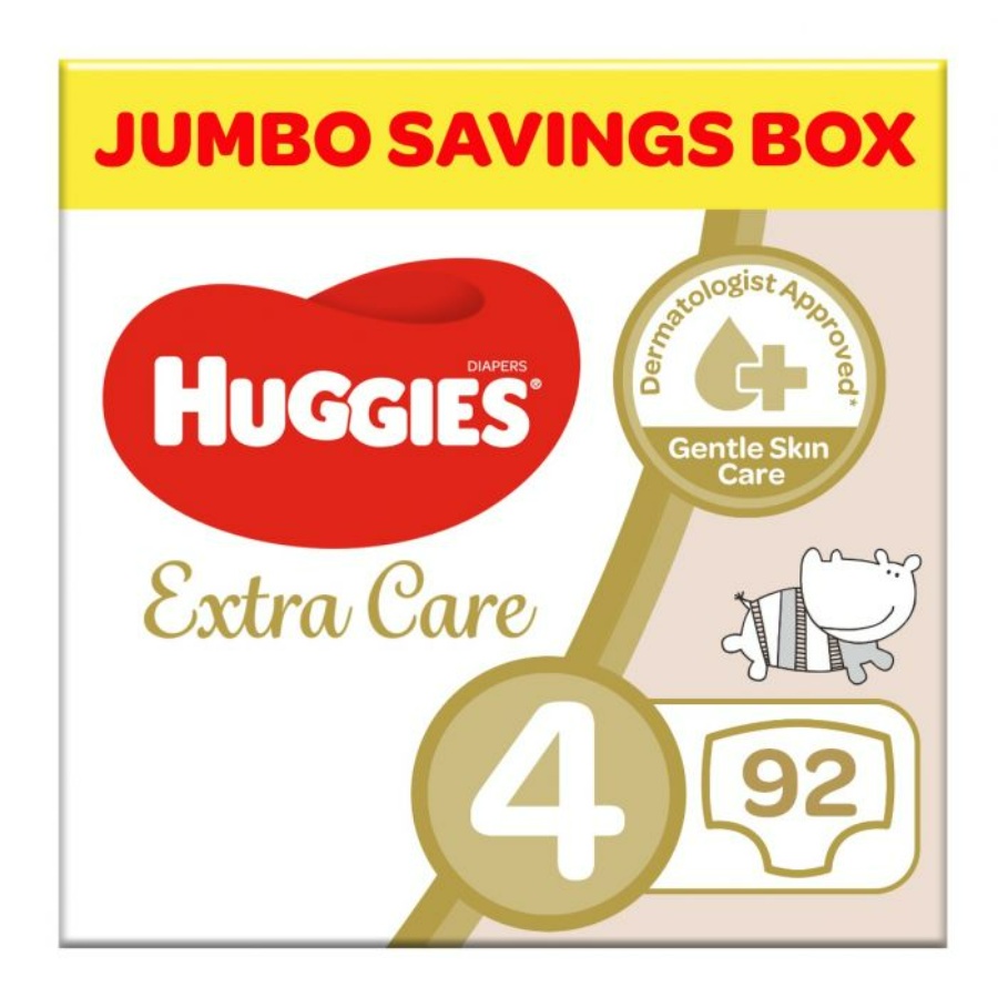 حفاضات هجيز اكسترا كير (عناية إضافية)، مقاس 4 (كبير)، عبوة جامبو بوكس تحتوي على عبوة واحدة من 92 حفاضًا، كود 40682. حفاضات فاخرة تركز على العناية الإضافية واللطف للبشرة الحساسة. تنسيق صندوق.