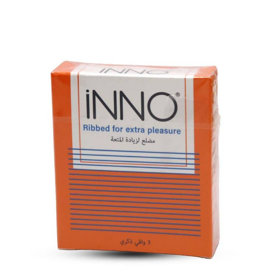 واقي ذكري إنو محزز في كرتونة تحتوي على 3 عبوات. كل عبوة تحتوي على عدد غير محدد من القطع (غالباً 3).