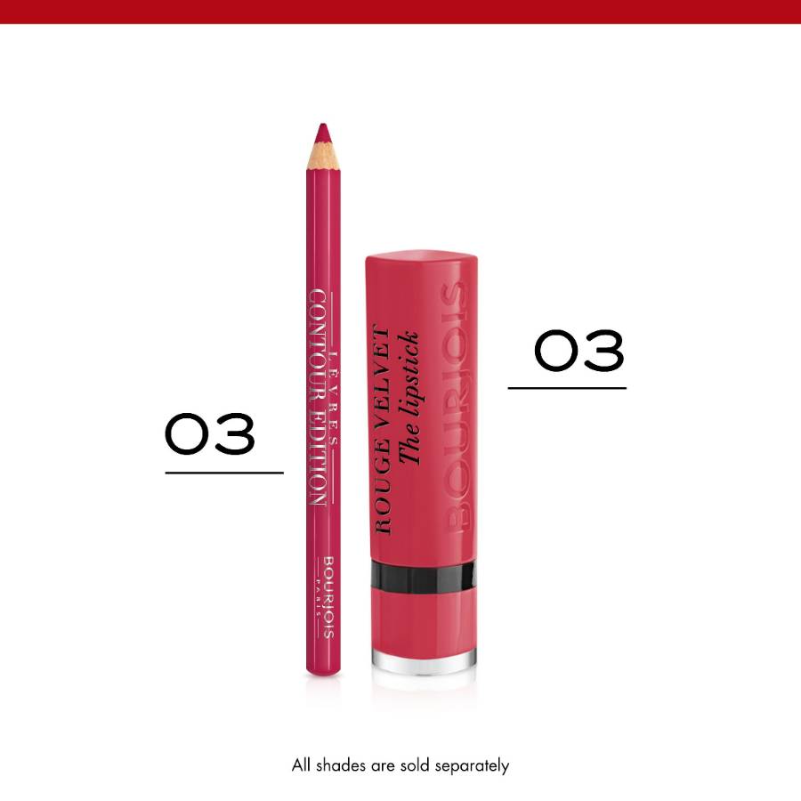 قلم تحديد الشفاه بورجوا ليڤر كونتور إديشن باللون 03 آليرت روز، الكود 0313، هو قلم تحديد شفاه لتحديد الشفاه. هذا اللون هو لون وردي ("روز")، يوصف بأنه 'ملفت' أو ساطع ("آليرت"). يوفر تحديداً دقيقاً ويساعد على إطالة ثبات أحمر الشفاه، مقدماً تحديداً وردياً جريئاً أو زاهياً.