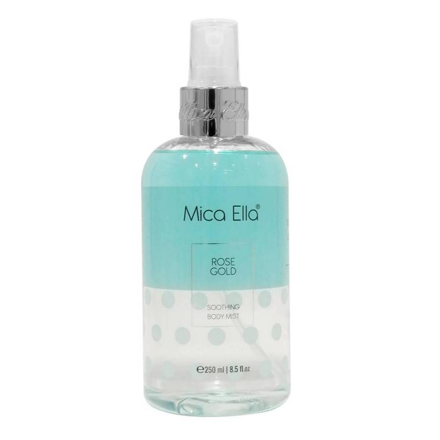 معطر جسم ميكا إيلا الملطف بنكهة روز جولد والسيليكون، حجم 250 مل. يجمع بين رائحة الورد الذهبي الفاخرة وخصائص السيليكون الملطفة. يوفر ترطيبًا خفيفًا ورائحة أنيقة تدوم طويلاً على البشرة.