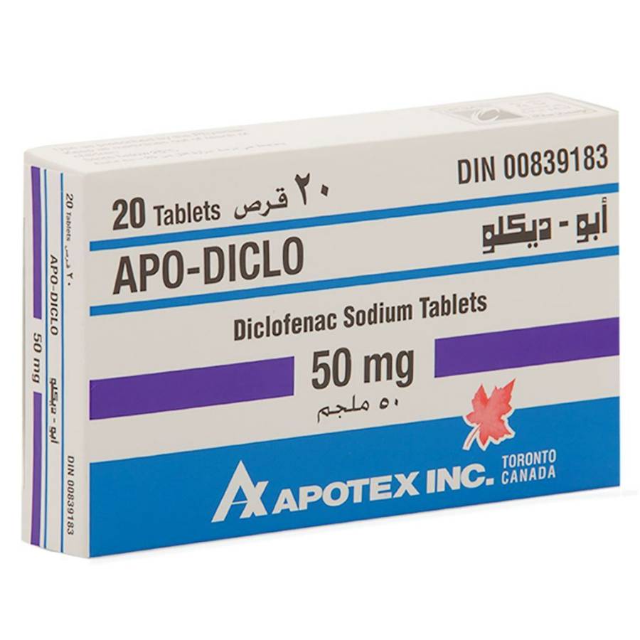 أقراص Apo Diclo بتركيز 50 ملغ هي دواء يُؤخذ عن طريق الفم يحتوي على 50 ملليغرام من ديكلوفيناك الصوديوم. تحتوي العبوة على 20 قرصاً. "Apo" تشير على الأرجح إلى الشركة المصنعة، Apotex. ديكلوفيناك هو دواء مضاد للالتهاب غير ستيرويدي (NSAID) يُستخدم لتخفيف الألم، تقليل الالتهاب، وخفض الحمى في حالات مختلفة مثل التهاب المفاصل، الالتواءات، وآلام الأسنان.