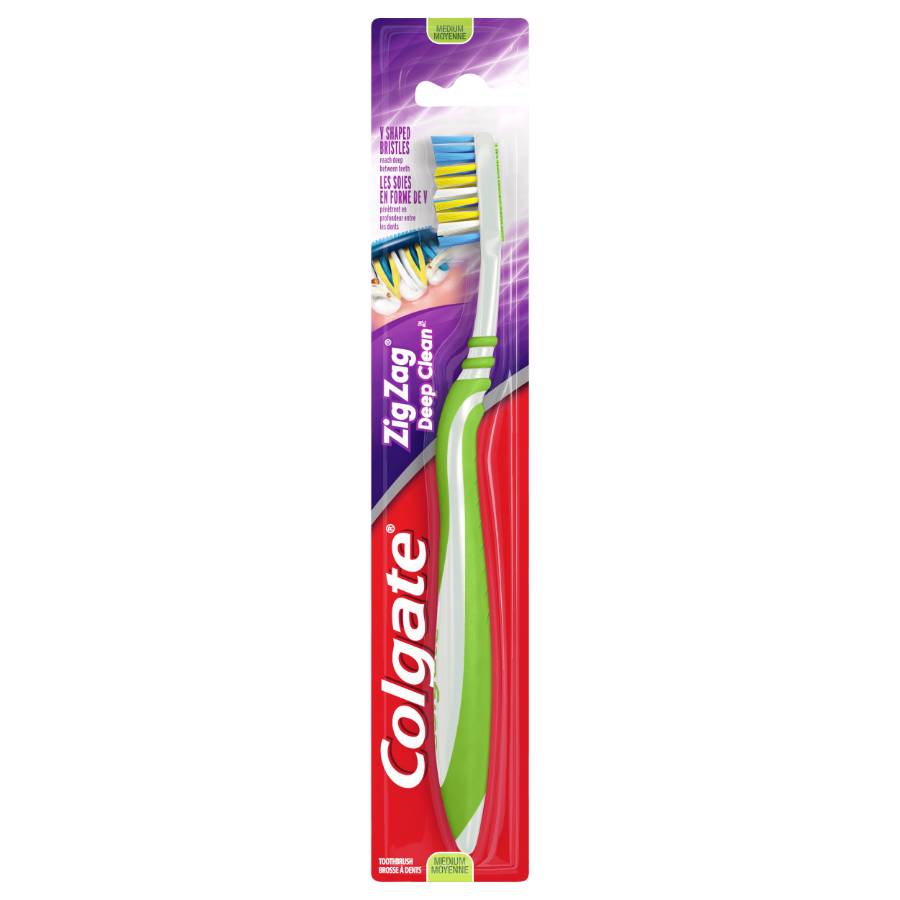 فرشاة أسنان كولجيت Zig Zag بشعيرات متوسطة. تصميم شعيراتها المتعرج مصمم للوصول بعمق بين الأسنان لإزالة البلاك بفعالية. توفر تنظيفًا شاملاً وتساعد في تحسين صحة الفم.