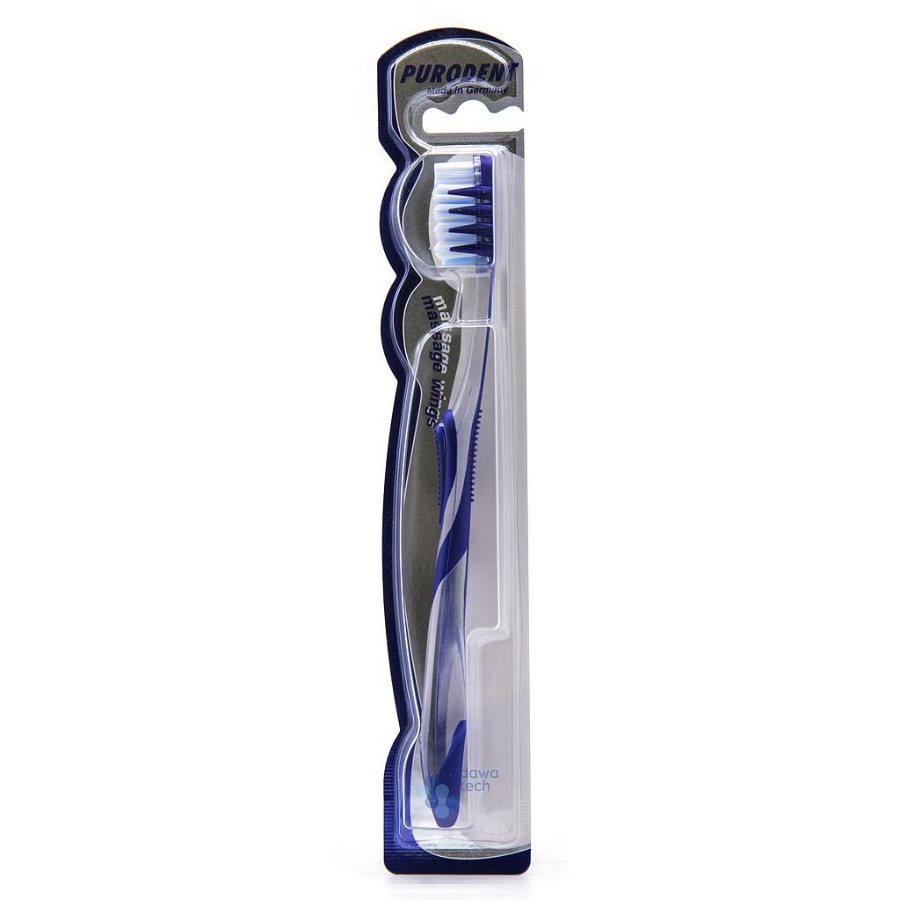 فرشاة أسنان للكبار برأس متعدد الوظائف بتصميم مريح وأجنحة تدليك، مع مقبض مبطن لسهولة الاستخدام. صناعة ألمانية.
