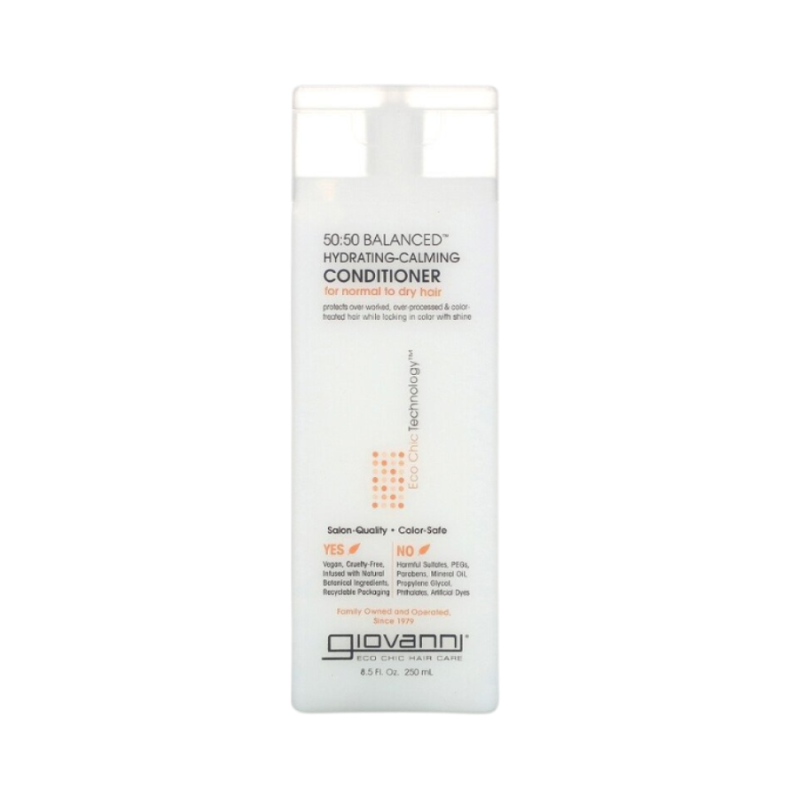 Post-cleansing conditioner Giovanni 50:50 Balanced Hydrating-Calming Conditioner For Normal to Dry Hair About the product: For normal and dry hair Eco Chic Technology™ Safe for color treated hair 100% plant based ingredients Protects stressed coloured and over-processed hair while maintaining its colour and shine. Does not contain: harmful sulfates PEGs parabens mineral oil propylene glycol phthalates or artificial dyes. Product Features: Moisturizes hair making it easier to comb and style. Rich in plant extracts that moisturize and reduce frizz. Moisturizes hair and balances pH. Ideal for hair that is stressed or damaged by environmental factors.